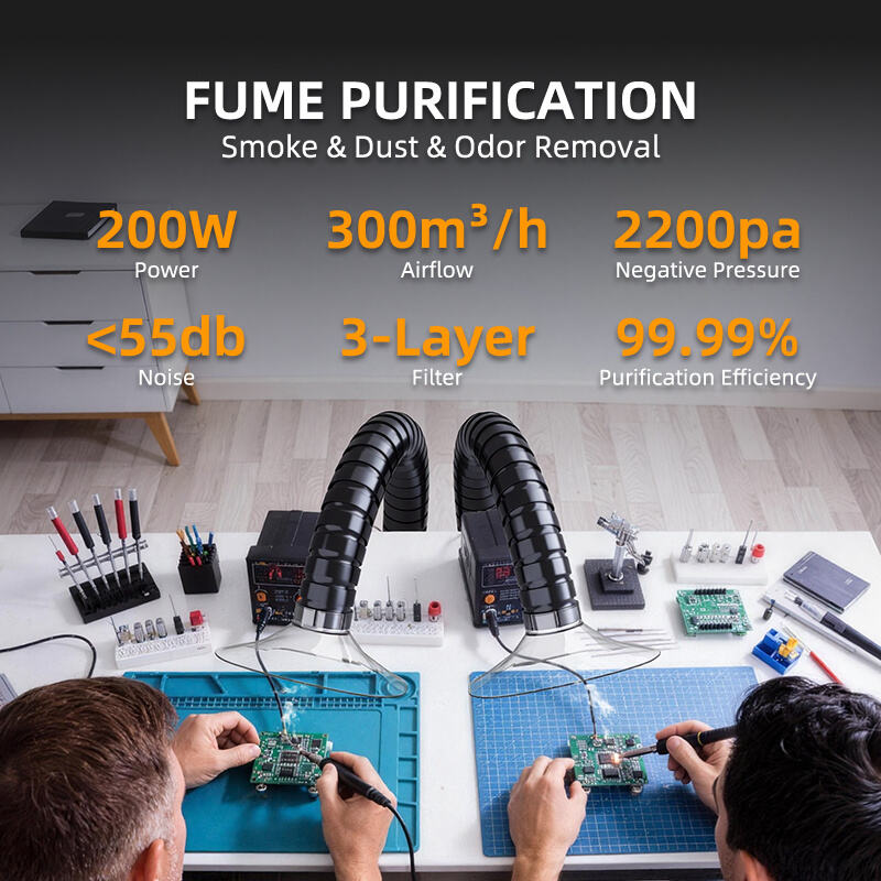 Are you troubled by soldering fume pollution?Will your equipment be affected by smoke and dust?Do you need to use one smoke purifier for two workstations at the same time?